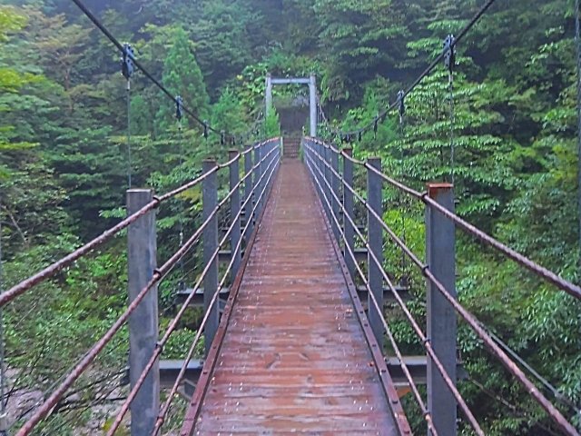 分かれ道となるさつき吊り橋。これを渡ると「楠川歩道ルート」へ、渡らずに登っていくと「奉行杉コース」の分かれ道となります。