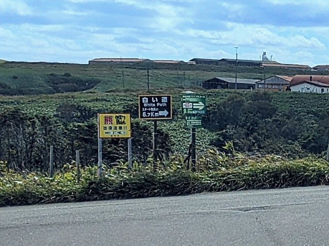 白い道へ向かうには、三角形の最北端の碑から道路挟んで反対側、「宗谷岬展望台」方面へ登って行きます。そこからは「白い道」の案内に従って宗谷丘陵を進んでいきます。