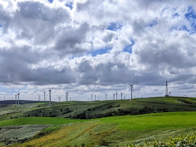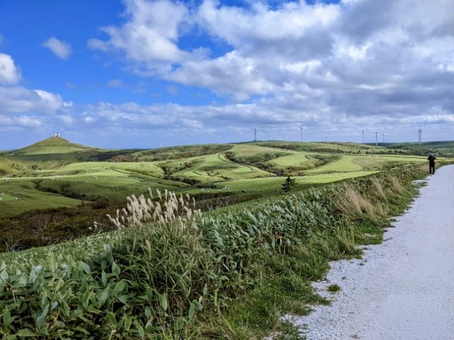 放牧されたウシや風車が立ち並ぶのどかな光景。最初は白い道まですごく遠回りに感じましたが、実際に走行してみると開放的なドライブルートなのですごく楽しめます。