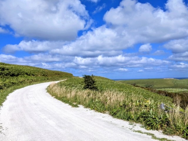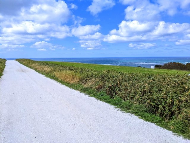 進んで行くと海が見えてきました!この白い道は丘陵地帯を走っているため、なんだか空へ飛んでいけそうな気持ちになります。
