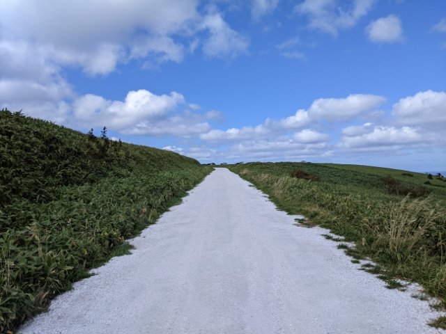 日本最北の丘陵である宗谷丘陵そこには稚内フットパスと呼ばれる全長11kmのウォーキングコースが造られています。そのうちゴール付近の約3kmはその姿から「白い道」として話題のスポット。名前の通り真っ白な道が続く白い道が広がります。