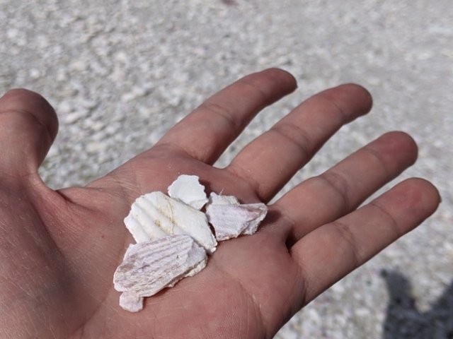 不思議な白い道ですが、この白さの正体はなんと貝殻!砕いたホタテの貝殻が敷き詰められているのです。走っているときは気づきにくいですが、よく見るとこんな感じで貝殻がそのまんま敷いてあります。