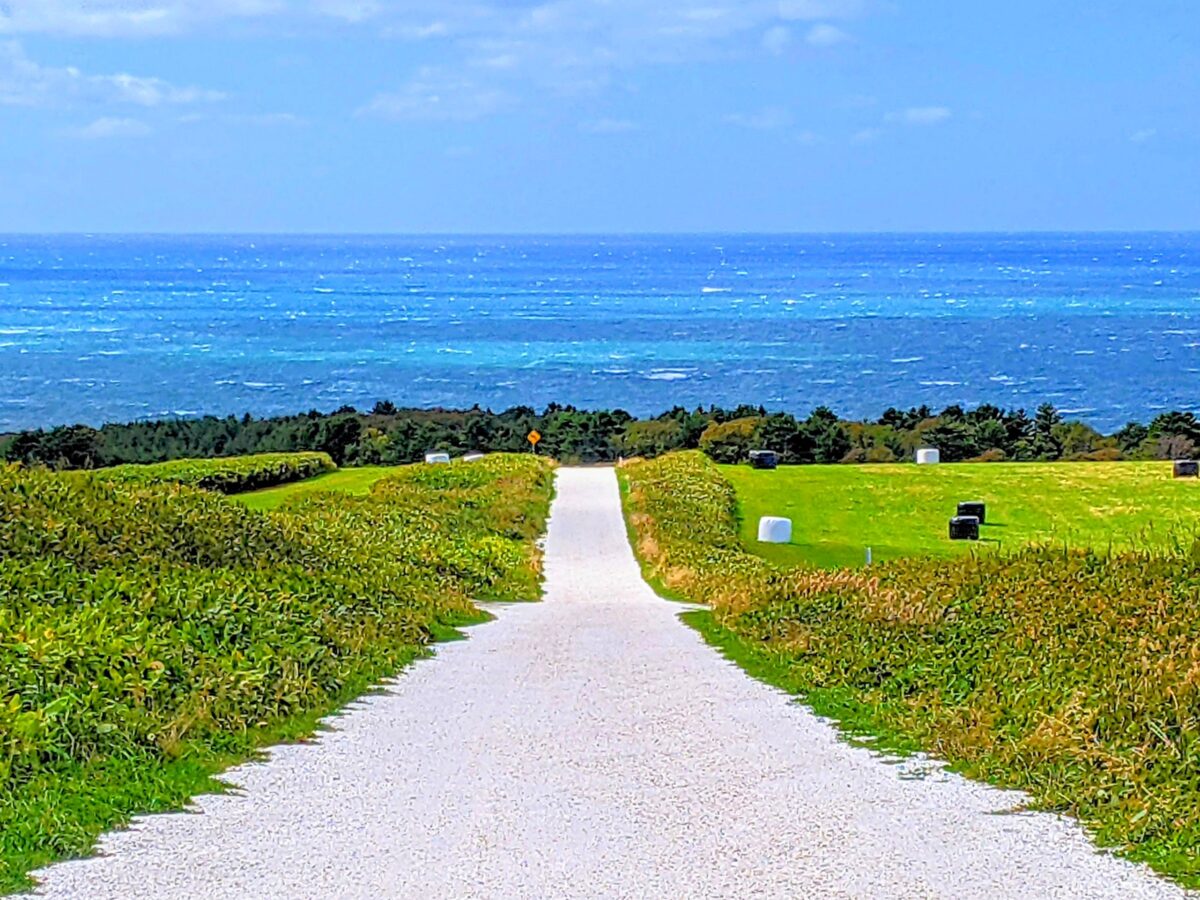 日本最北の丘陵である宗谷丘陵そこには稚内フットパスと呼ばれる全長11kmのウォーキングコースが造られています。そのうちゴール付近の約3kmはその姿から「白い道」として話題のスポット。名前の通り真っ白な道が続く白い道が広がります。