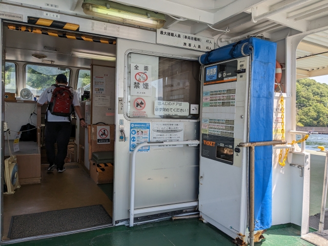 港の待合所に乗船券の自動券売機がありますが、船の中にも券売機ありました。もし時間がギリギリなときは、とりあえず乗船してしまった方が良さそうです。