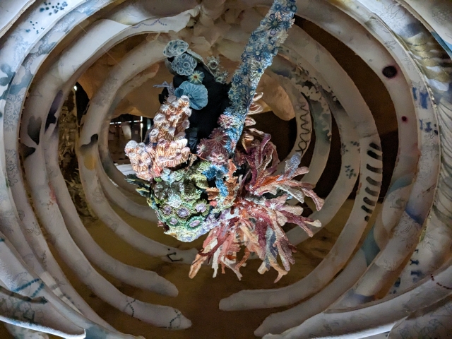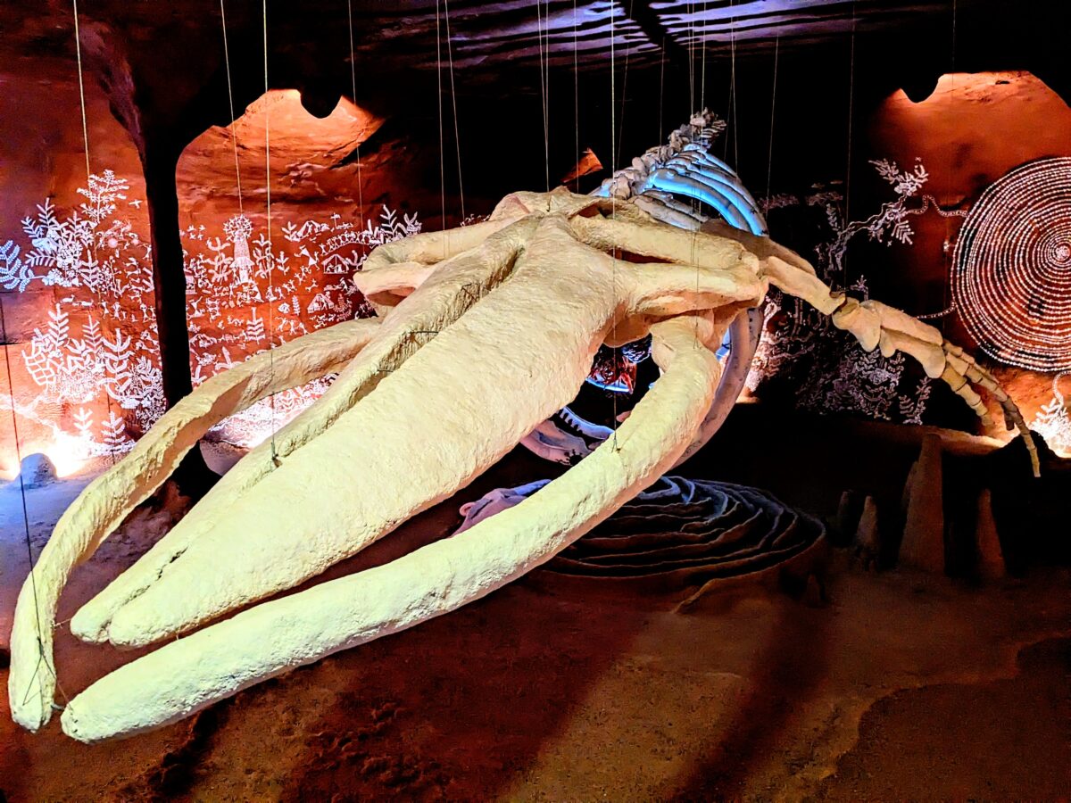 作品名は《言葉としての洞窟壁画と、鯨が酸素に生まれ変わる物語》。海に浮かぶクジラの死骸から着想したという作品で、巨大なクジラの骨が安置された洞窟になっています。クジラの骨は実物ではなく、トイレットペーパー芯、壁は古新聞などを使用した紙粘土を使用して造り上げられました。