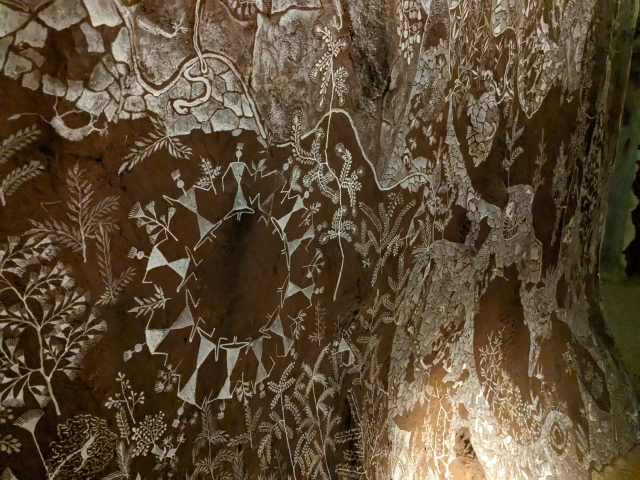 壁一面に描かれた壁画はインドのワルリー族出身のアーティスト・マユール・ワイェダさんがこの島に訪れて描いたもの。人類の進化や様々な精霊が描かれた神秘的な作品です。