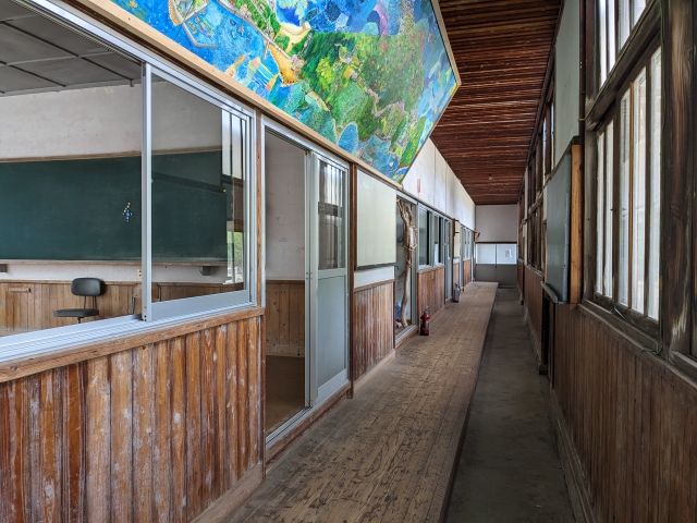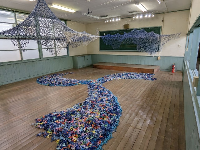この施設は、閉校となった「旧粟島中学校」の校舎を活用しています。ノスタルジックな学校の雰囲気と、そこに置かれたアート作品のコントラストがあざやか。
