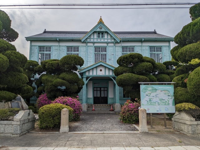 淡いグリーンがあざやかな木造建築。こちらは明治30年に建てられた日本最古の海員学校である旧粟島海員学校本館。