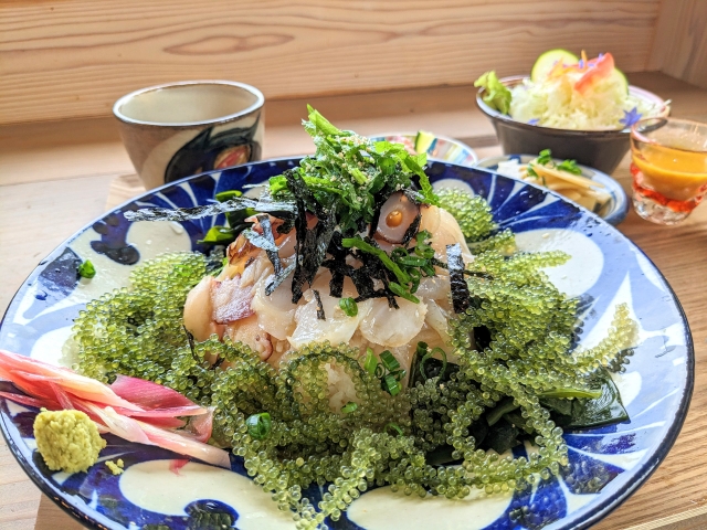 なお、食器はすべて「やちむん」(沖縄の陶器)。メニューにもオリオンビールや泡盛、海ブドウなどもあり、沖縄色は濃い目です。