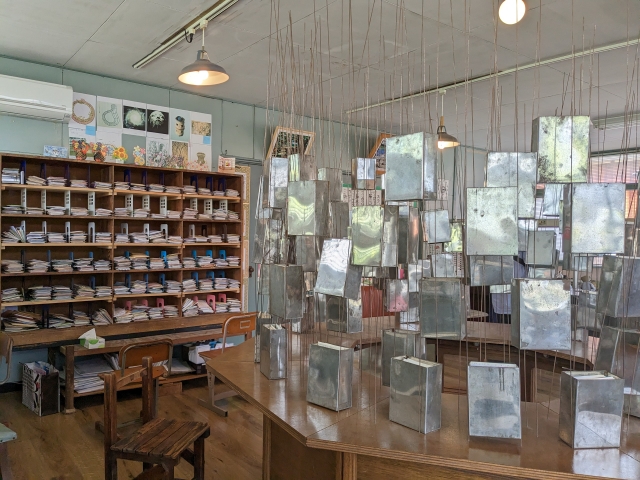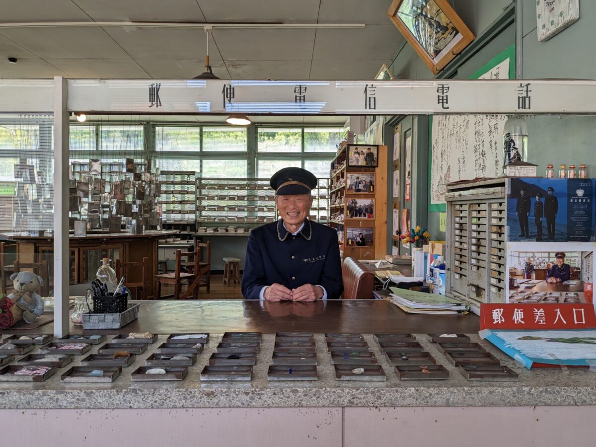館内に積み重なるのは封筒やハガキなど数多の郵便物。郵便局らしい木製の配達区分棚はもちろん、吊るされたブリキらしき缶にも多数のハガキが収納されています。