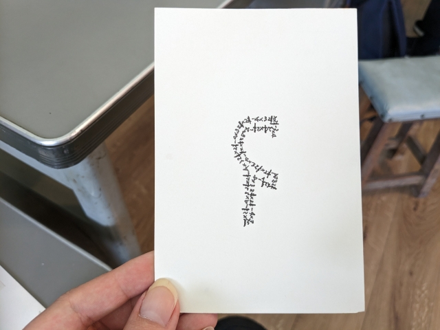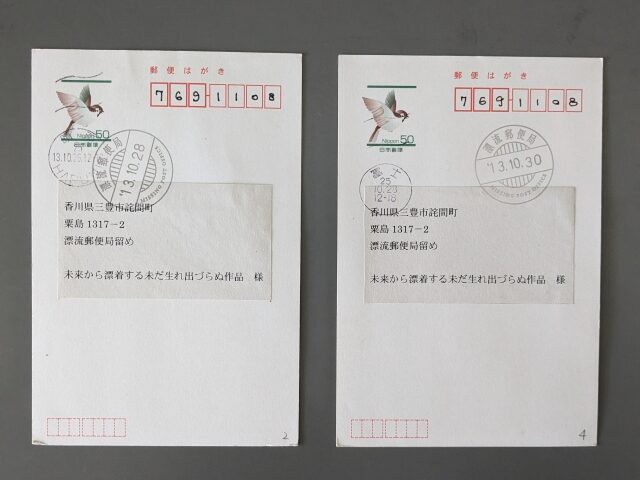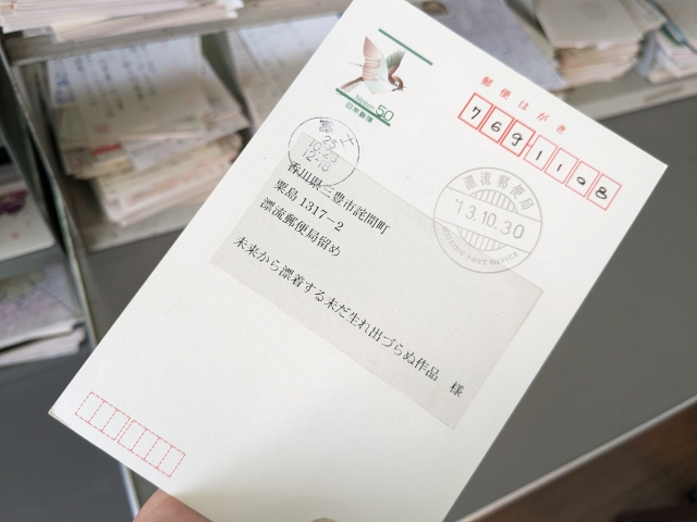 裏返して見ると、差出人は不明ですが宛名は「未来から漂着する未だ生れ出づらぬ作品様」と、これまた意味深な記載。