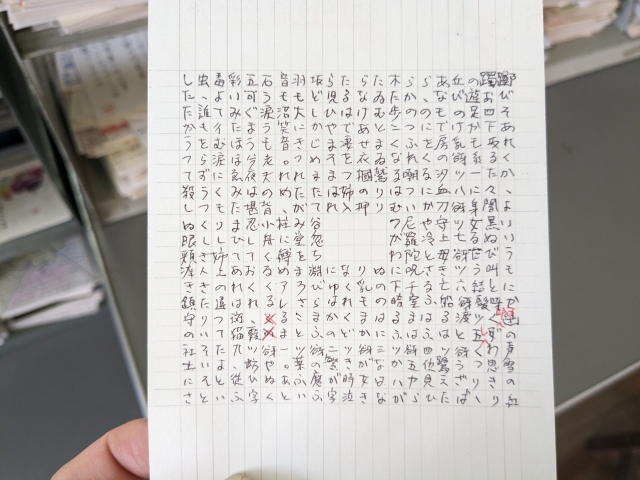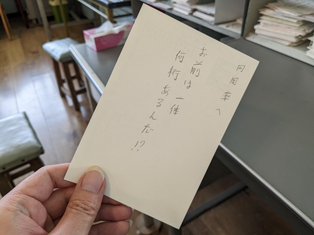 よく見ると右下に「2」「4」と記されています。「1」「3」など、他の数字のハガキがあるのかもしれないと、ハガキの山を探してみるも見つかりません。漂流郵便局には検索機能などは無く、見た人によって容易に並べ替えが行われるのでみつけるのは困難なのです。
