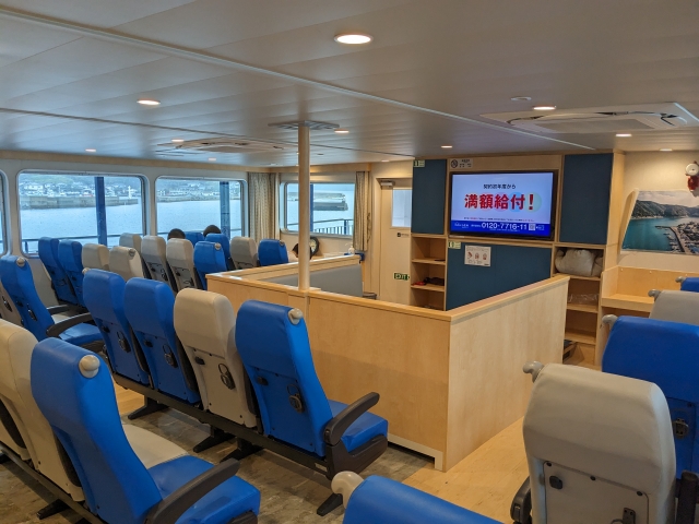 船内は屋内の椅子席がメイン。テレビもあり、ちょっとした雑魚寝スペースも用意されています。新造船なので、どこもかしこもぴかぴかです。
