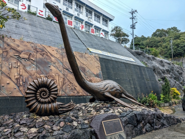 港で来島者を出迎えるのはアンモナイトと首長竜のモニュメント。この首長竜は「サツマウツノミヤリュウ」といい、獅子島の幣串にて化石が見つかった種類です。鹿児島県の旧国名「薩摩」と、発見者である宇都宮聡さんの名前を冠しています。