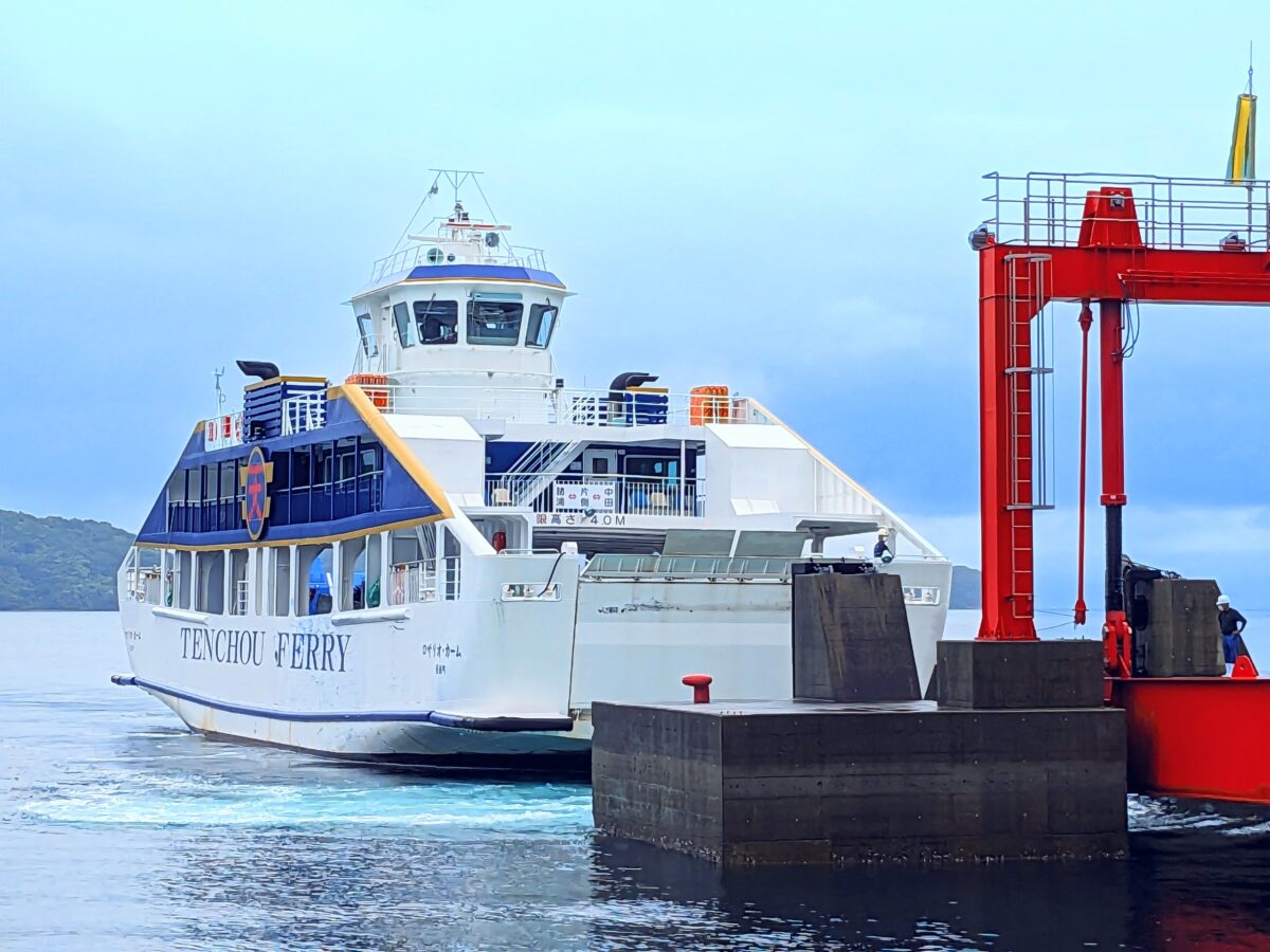 そんな獅子島へと行く船は、天長(てんちょう)フェリーが運行している「フェリーロザリオ」(1日8便)があります。鹿児島県の諸浦港と、熊本県の中田港の2ヶ所から乗船可能で、獅子島の片側(かたそば)港へと寄港します。