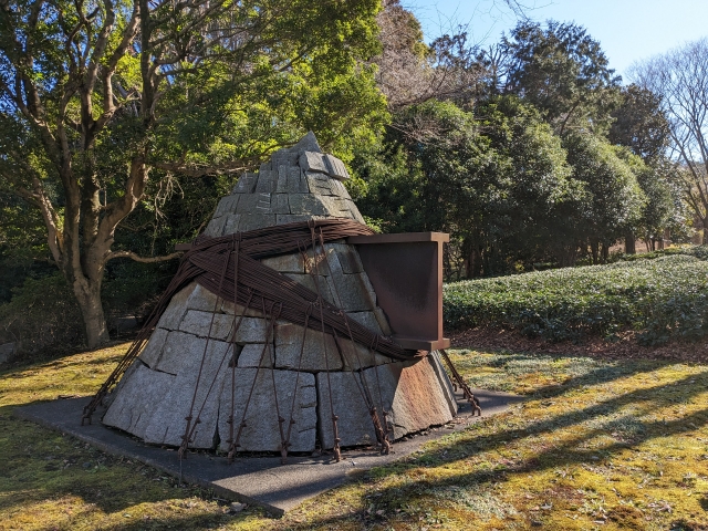 積み上げられた石を錆びついた鉄骨が貫通し、ワイヤーで固定されている作品。古代の竪穴住居のようなシルエットに現代的なものを貫かせ、それが風化していく姿がなんだか寂しげ。縛られたような姿からは閉塞感も伝わってきます。