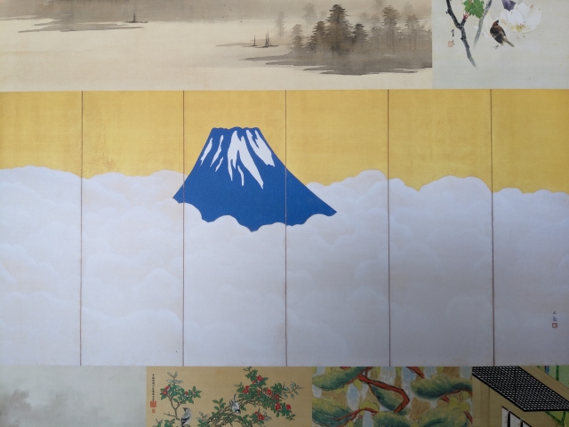 インパクトがあるのは、展覧会のポスターにも採用されている《群青富士》by 横山大観。1917〜18年という大正時代に描かれた屏風絵ですが、白い雲の中にくっきりと浮かび上がる富士山はまるでポップアート。モダンなデザインが屏風に描かれているということに違和感すら覚えます。