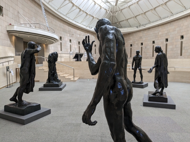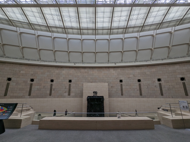 フランスの彫刻家オーギュスト・ロダンの作品を展示するために、1994年にオープンしたロダン館。美術館の展示室から続く連絡通路を進むと、広大なホール状の展示室が広がります。通常の展示室は撮影不可ですが、ここは写真撮影可能というのもポイントです。