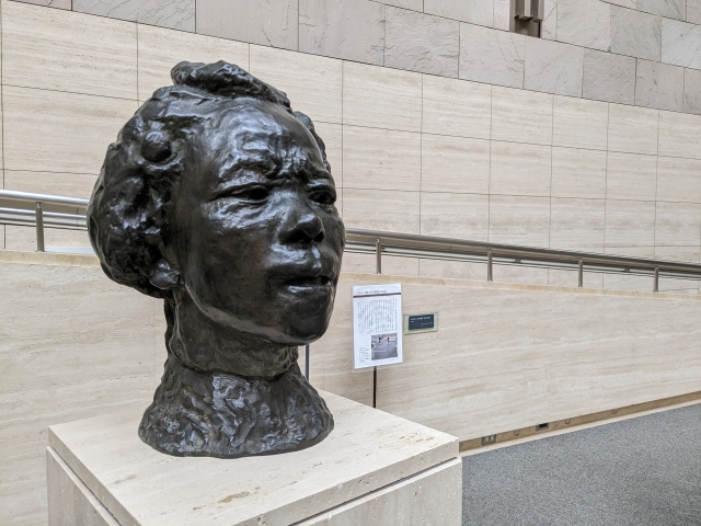 こちらの頭部は《花子のマスク》。日本人の踊り子である花子をモチーフにした像です。この花子という人物は、ロダン作品唯一の日本人モデル。旅芝居の一座としてヨーロッパを巡業していた花子の演技に惹かれたロダンは、58点もの作品を制作したそうです。