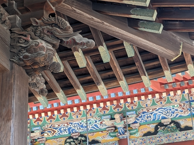 総門をくぐった先に見える立派な楼門は、江戸時代である文化13年に竣工したもの。水呑の龍や力神などの彫刻で彩られている豪華な門です。