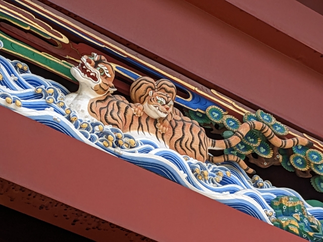 楼門に描かれているのは中国の説話に基づく「虎の子渡し」。
