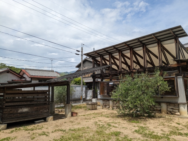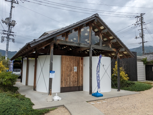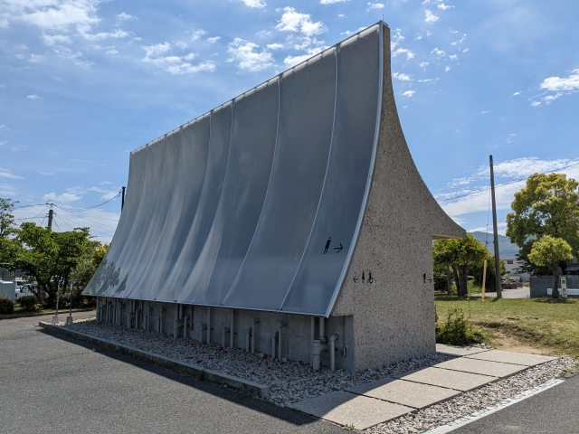 馬木散策路 駐車場の目の前に立つ公衆トイレ。こちらは《おおきな曲面のある小屋》by 島田陽 というアート作品。曲面となっている白い壁とそれを覆う瓦屋根、それぞれは接触せずに独立しています。