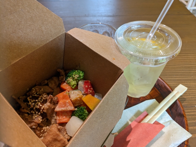 名物の醤(ひしお)丼もあります。醤の郷のもろみ味噌を使用して焼いたお肉と旬の野菜がつまったランチボックス。もちろんテイクアウトも可能です!