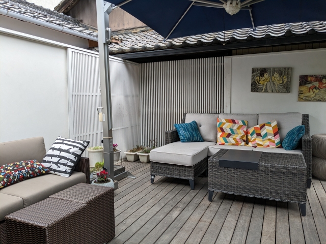 テラスに置かれたパラソルやソファがとってもラグジュアリーな雰囲気。アートめぐりの休憩にぴったりです。
