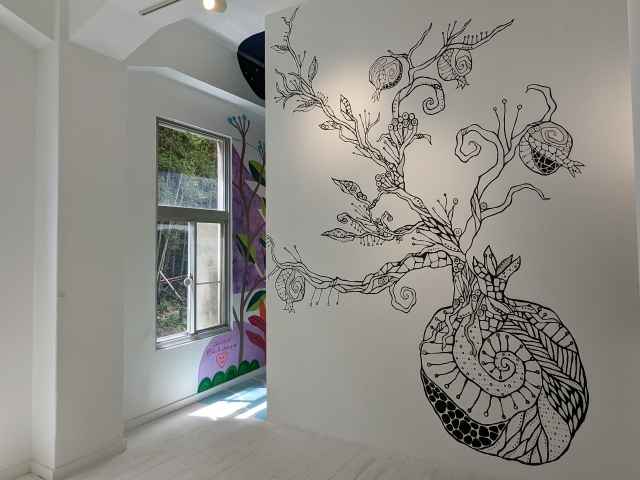 壁一面に描かれたモノトーンの作品。こちらは《Shape of life「森と共に」》by 小野純一。描かれている森の精やザクロはまだ未完成らしく、10年かけて完成する予定とのこと。