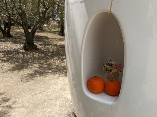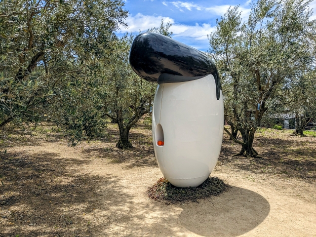 ユニークな姿から人気が高いのが《オリーブのリーゼント》by 清水久和。オリーブの木に包まれた白い卵のような不思議な物体は、リーゼントヘアでばっちりとキメています。