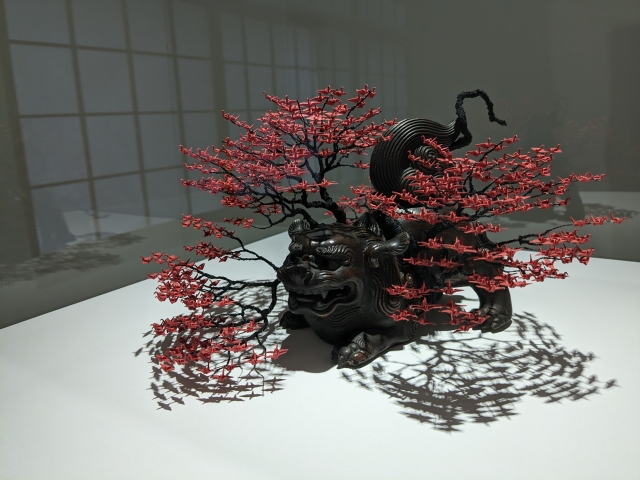よく見るとこちら、折り鶴で構成されています。わずか1cm四方の折り紙で作られたツルが無数に集まった集合体、その精巧な技術にただただ驚かされます。