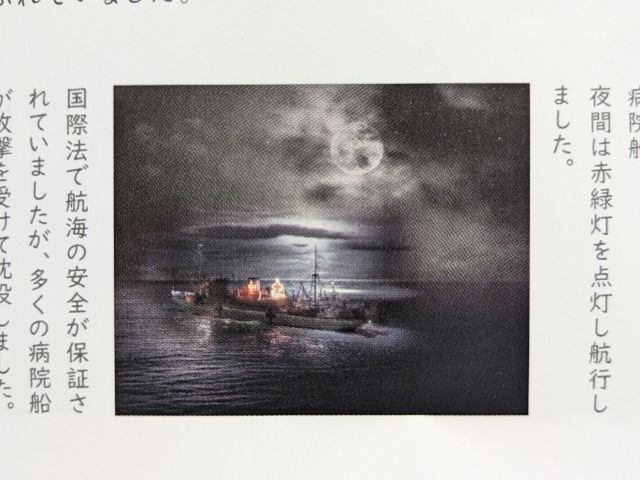 病院船は純白の船体に緑の帯、赤十字の標識が大きく描かれていました。国際法で航海の安全が保証されていましたが、多くの病院船は攻撃を受けて沈没してしまっていたそう。館内で見ることができる実際の証言では、戦闘機が接近するも攻撃はなく離れていったというお話もありました。