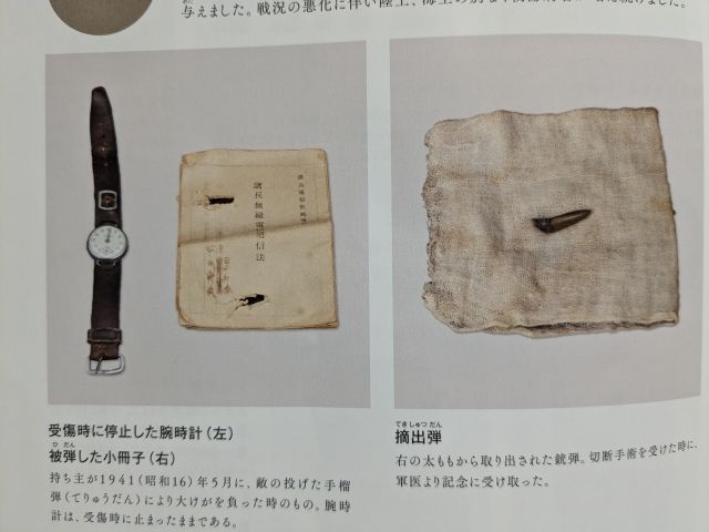 徴兵、入営、出征、戦地での生活と続く流れの中で展示されているのは、実際に兵士が撃たれた銃弾である摘出弾や、止血に用いた日章旗、受傷時に停止した腕時計など生々しい品々。