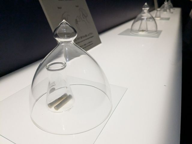 蘭奢待のまわりには香りの体験コーナーも。蘭奢待を特製の枠に入れシートで覆って香りの成分を採取、数ミリの脱落片を加熱して成分を科学分析、そして調香師がその香りを嗅いで科学分析から導き出される香りをもとに再現していったそう。