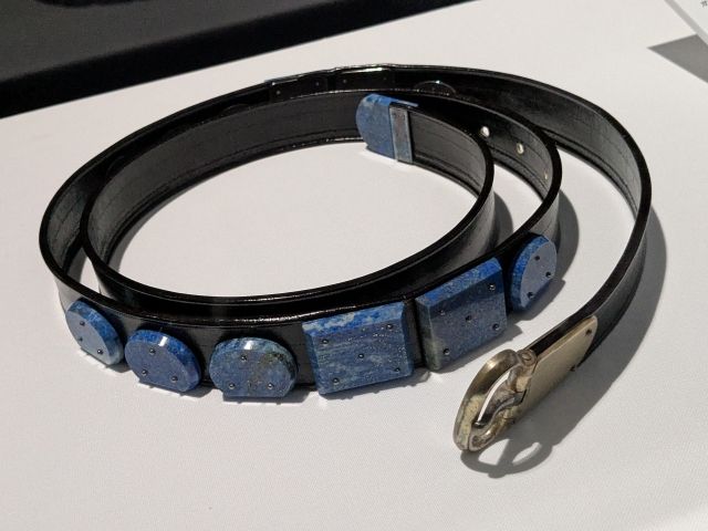 シルクロードを通って伝わった、異国情緒あふれる宝物も多数。こちらの紐玉帯(模造)は、アフガニスタン産の紐玉(ラピスラズリ)で飾った革の帯。先ほどのお櫃のような螺鈿箱に収められていたものです。帯とはつきますが、その形状は現代のベルトとほぼ同じ。現代ファッションにもハマりそうなおしゃれアイテムで、1000年以上も前の宝物とは信じ難いデザイン。