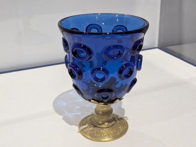 瑠璃杯(レプリカ)はブルーのガラス器に金色の台脚がついた鮮やかな逸品。イラン周辺で作られたガラスに中国で台脚がつけられ、日本にもたらされたそうです。