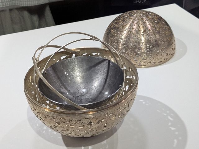 シルバーの球体は銀薫炉(模造)という、内部の皿にお香を入れて、衣服に香を焚きしめるための道具。お皿の部分は3重の輪が取り付けられており、球体を傾けても常に水平になる仕組みとなっています。これはジャイロスコープですね!