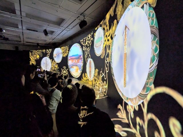 最新の技術で宝物をスキャンして作成した超高精細の映像を、巨大スクリーンで上映。様々な宝物の美しい意匠の細部や質感を表現しています。きらびやかなデジタル映像は、万博パビリオンを思い出してしまいますね。