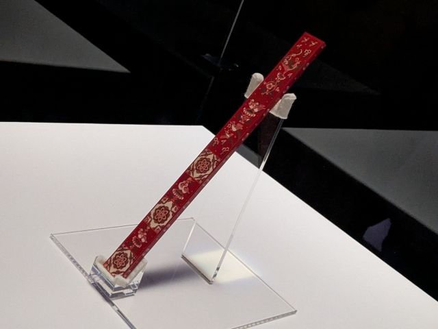紅牙撥鏤尺(模造)は、儀式用の物差し。象牙の表面を染めて彫刻する「撥鏤(ばちる)」という技法が使われています。物差しということは、側面の模様が目盛りになっているのかな。