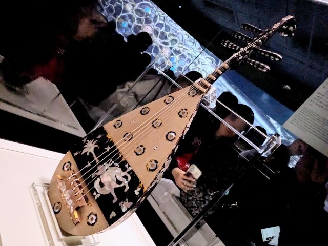 教科書でおなじみの代表的な宝物、螺鈿紫檀五絃琵琶(模造)。その鮮やかな装飾は、600を超えるヤコウガイとタイマイのパーツからできており、「撥受」(※ピックアップがありそうな部分)にはラクダに乗る人の姿が描かれています。世界で唯一現存している五絃の琵琶とのことですが、五絃の琵琶って他にはないのでしょうかね。