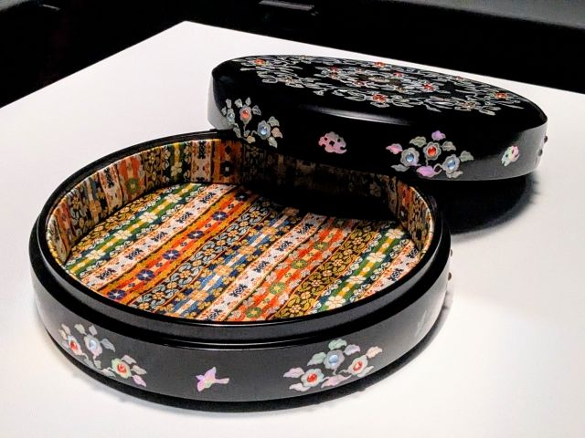 こちらのお櫃のような箱は螺鈿箱(模造)。ラピスラズリで飾った紺玉帯を収めていた箱で、ヤコウガイの唐花文様や彩色された水晶が静かに輝きます。