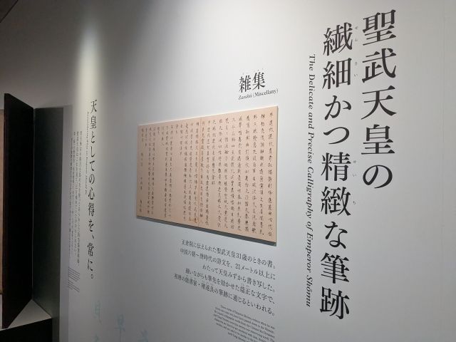 まずは聖武天皇と光明皇后の紹介からスタート。聖武天皇の31歳のときの書「雑集」は、中国六朝〜唐時代の詩文を21m以上に渡り写したもの。つまり、ここに記された文字は聖武天皇の直筆。文字の美しさはもちろん、上下左右を均等に連ねるスキルが凄いです。