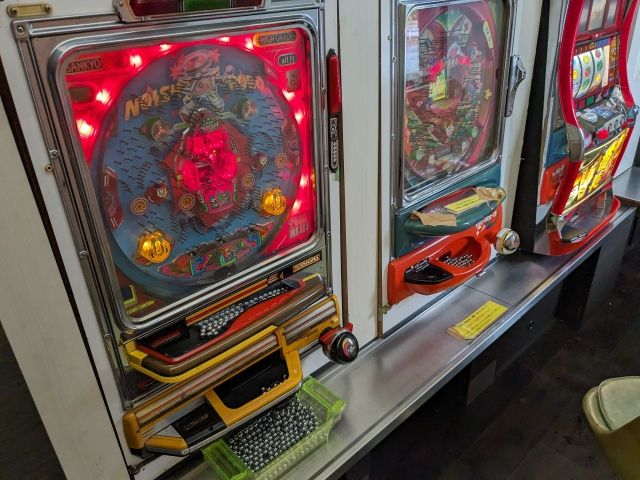 ずらりと並ぶパチンコ台。こちら、フリーで遊び放題!よくわからないけどやってみたら、玉がいっぱい出てきてしまい、やめられなくなりました!こうやって人はギャンブルにハマっていくのでしょうね。