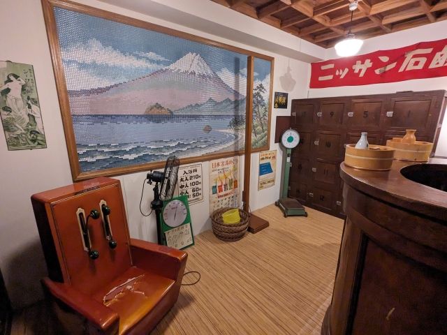 様々なお店は、実際に中を覗くことができます。銭湯の入口となる番台には、とっくりの入った桶やマッサージチェア、富士山のタイル画など、これぞ銭湯といった仕上がり。