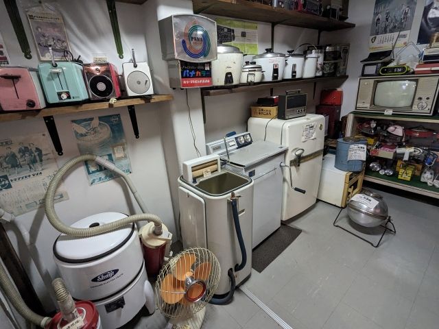 ずらりと並ぶ懐かしの家電。手回し脱水機、まるっこい冷蔵庫、白黒のブラウン管テレビ、アイロン、ドライヤー、ラジカセなど、今でも見かけるモノから全く見かけないモノまでたっぷりと集まっています。昭和30年代頃には電気洗濯機、電気冷蔵庫、白黒テレビが「三種の神器」と呼ばれていたときいたことがありますが、まさにその頃でしょうかね。