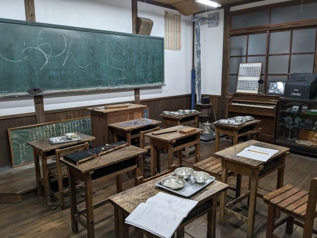 木の学習机がずらりと並んだ教室。黒板、足踏みオルガン、エレクトーンなど、ノスタルジックなものがたっぷり。こんな教室で授業を受けた記憶は無いハズなのに、机に座ってみるとあの頃に帰ったような気持ちになります。