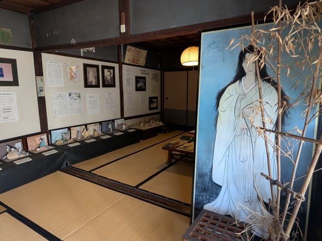 16畳ほどの座敷が広がっており、白い服を着た妖艶な女性のプレートが。