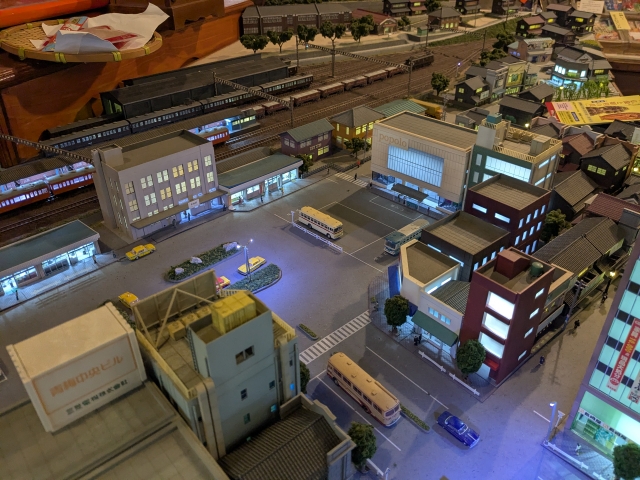 昭和40年代の青梅駅前のジオラマも。切妻屋根の家屋がずらりと並ぶ様子は、今とはちょっぴり異なっています。築100年を迎えた青梅駅舎は、やっぱり変わっておりません。