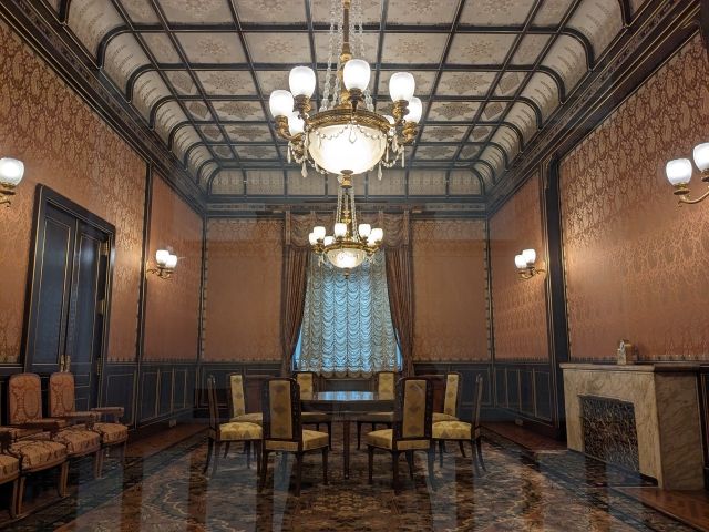 各政党に割り当てられる控室が続く中、ひときわ特別感の漂う一室。こちらは皇族のための「皇族室」。折り上げ格天井がゴージャスな仕上がりの部屋です。