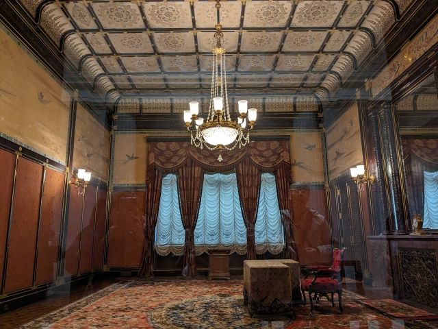 そして、その隣にあるのが「御休所(ごきゅうじょ)」。天皇陛下がお休みになる部屋であり、純金製の時計や描かれた鳳凰が特別感を漂わせます。